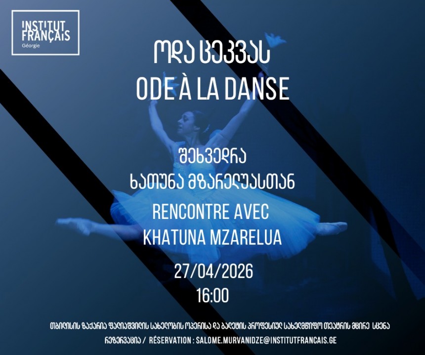 ცეკვის საერთაშორისო დღესთან დაკავშირებით, საქართველოს ფრანგული ინსტიტუტი, თბილისის ზაქარია ფალიაშვილის სახელობის ოპერისა და ბალეტის პროფესიულ სახელმწიფო თეატრთან და ვახტანგ ჭაბუკიანის სახელობის თბილისის საბალეტო ხელოვნების სახელმწიფო სასწავლებელთან პატნიორობით, 2026 წლის 27 აპრილს, 16:00 საათზე, თანამედროვე ცეკვის მკვლევარ ხათუნა მზარელუასთან შეხვედრაზე გეპატიჟებათ, რომელიც ამ საერთაშორისო თარიღთან დაკავშირებულ საჯარო ლექციას წაიკითხავს, ფოტო და ვიდეო მასალების თანხლებით.